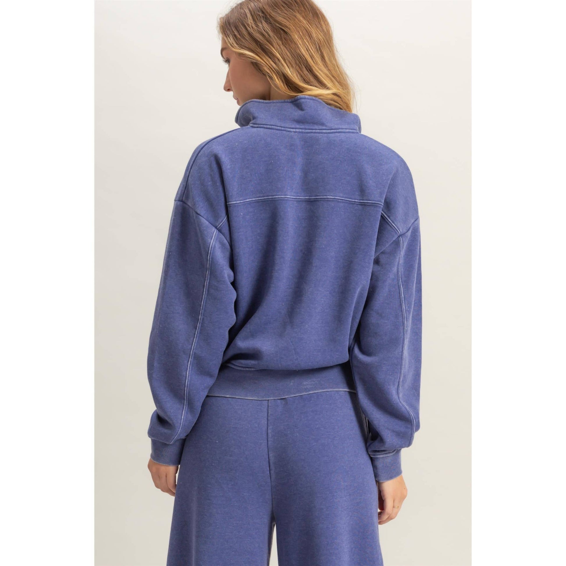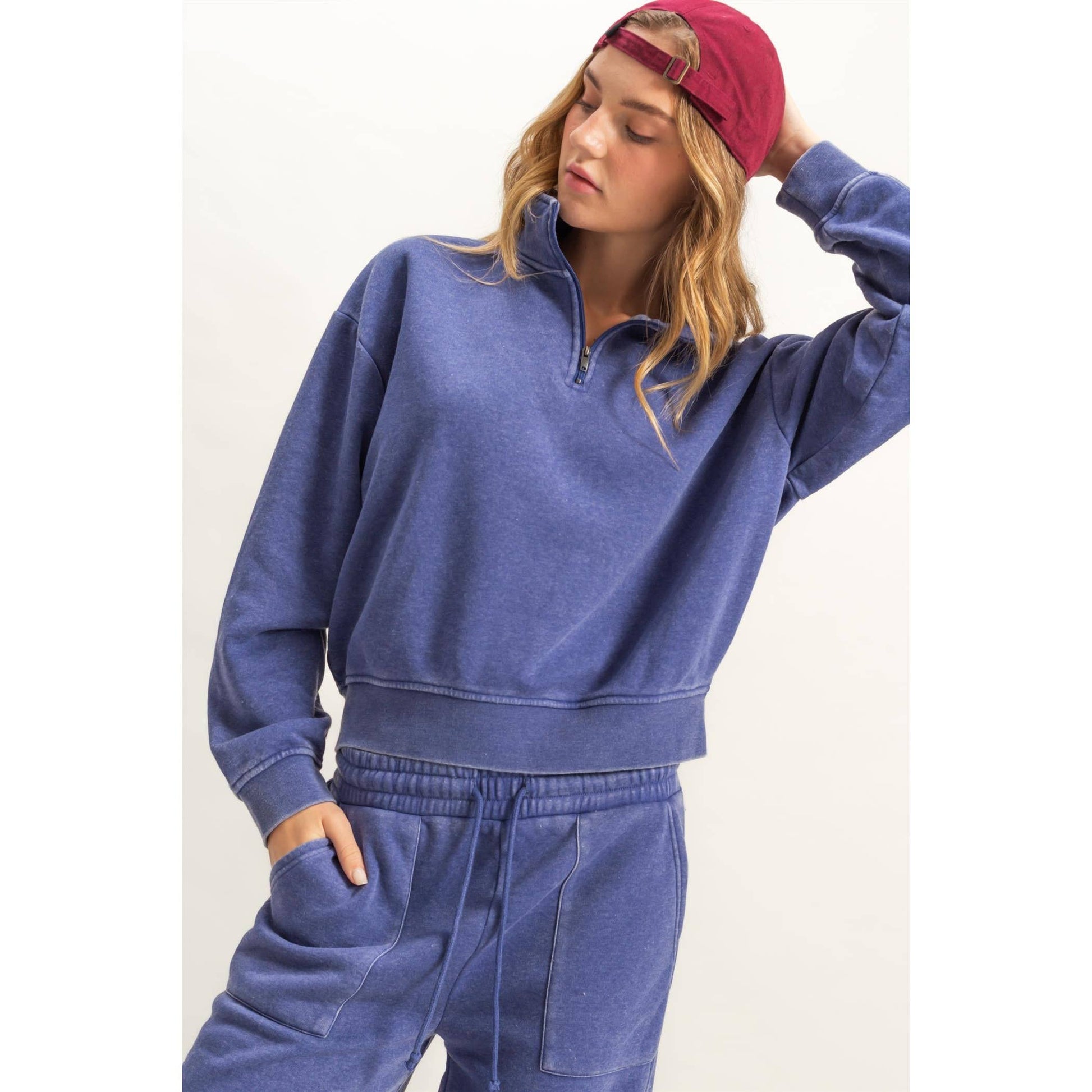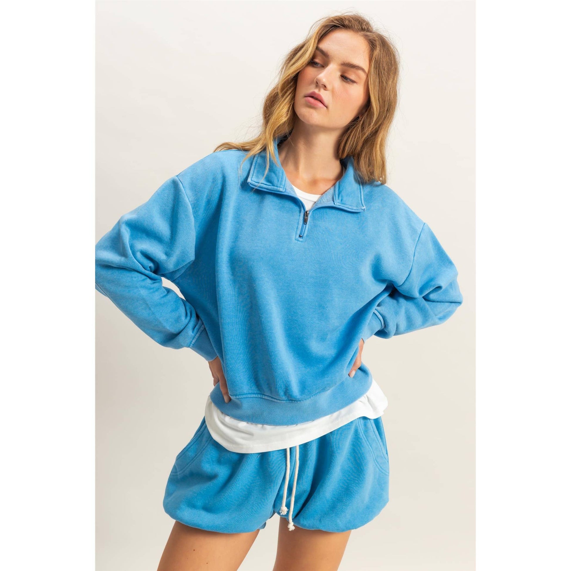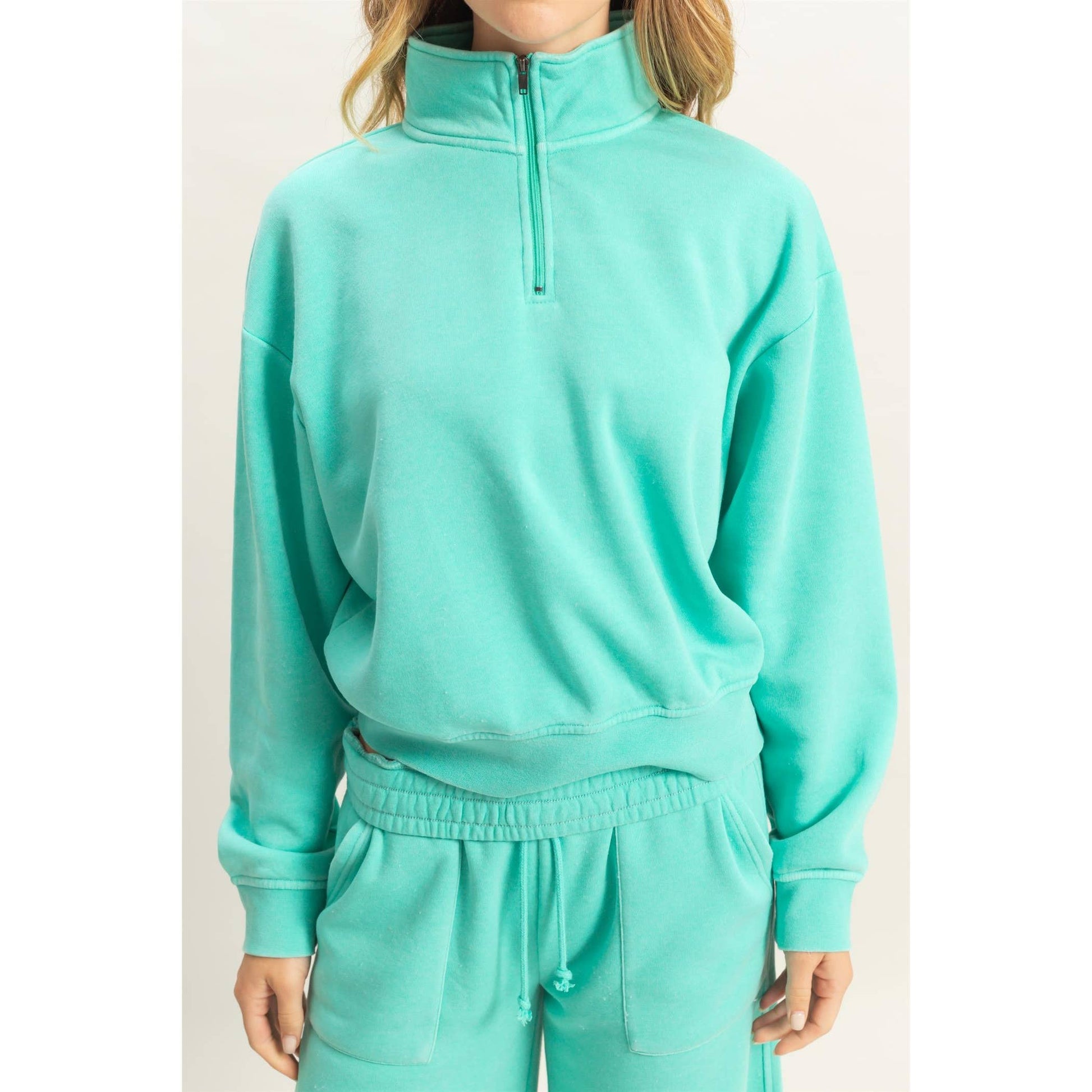 Take A Break And In This Brushed Terry Knit Sweatshirt That Shapes Into A Cute Top That Has A Standing Collared Neckline Boasting A Half Zipper At Front, Long Sleeves With Drop Shoulders, And Banded Cuffs. A Casual Boxy Bodice Ends With A Banded Hem.