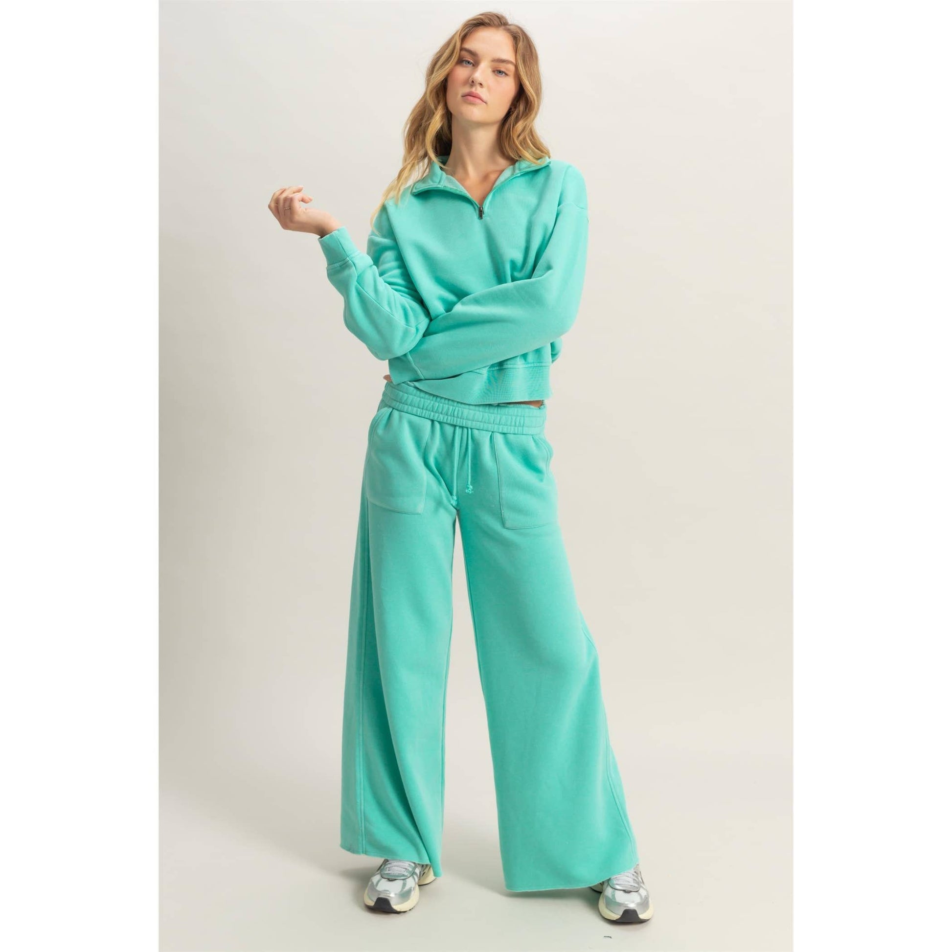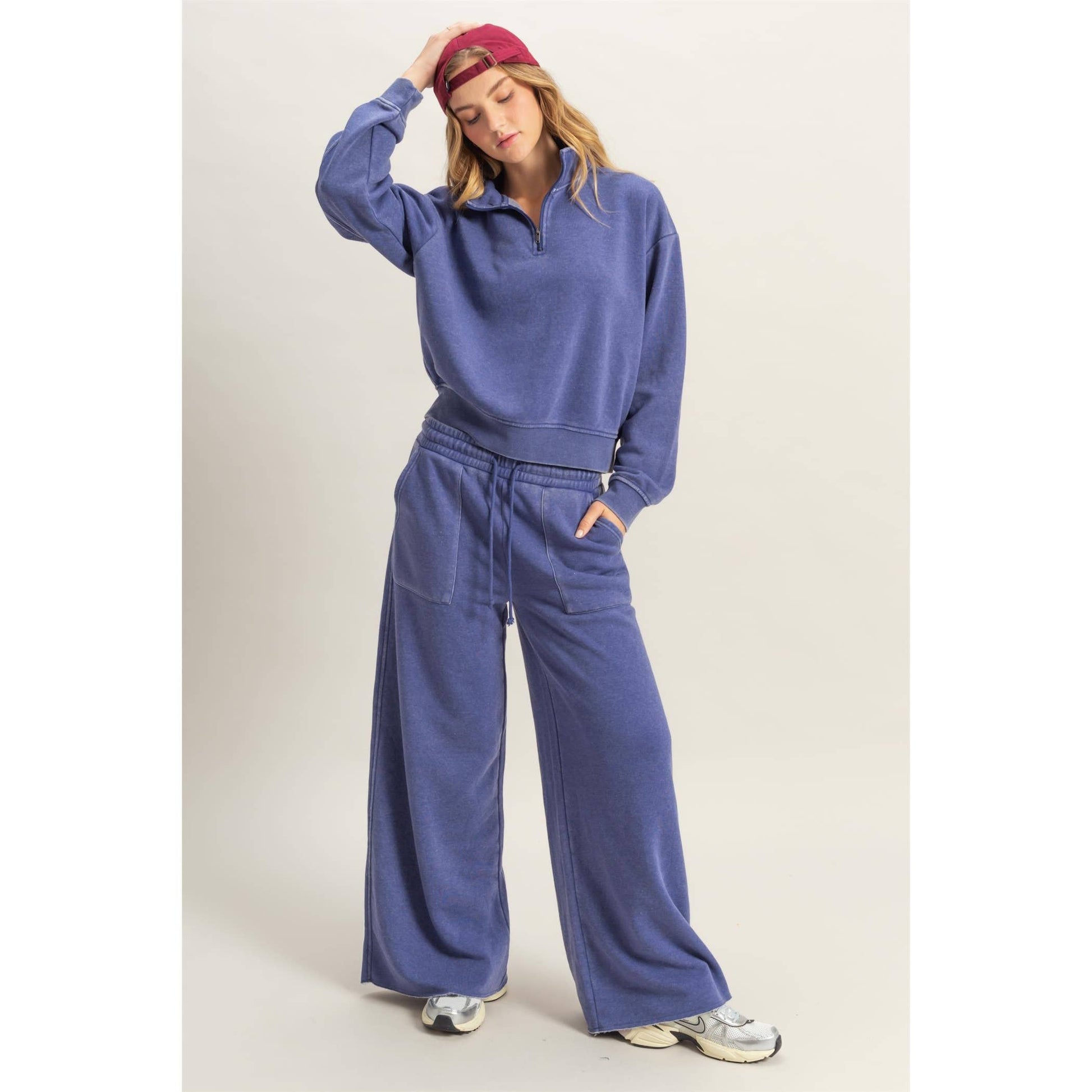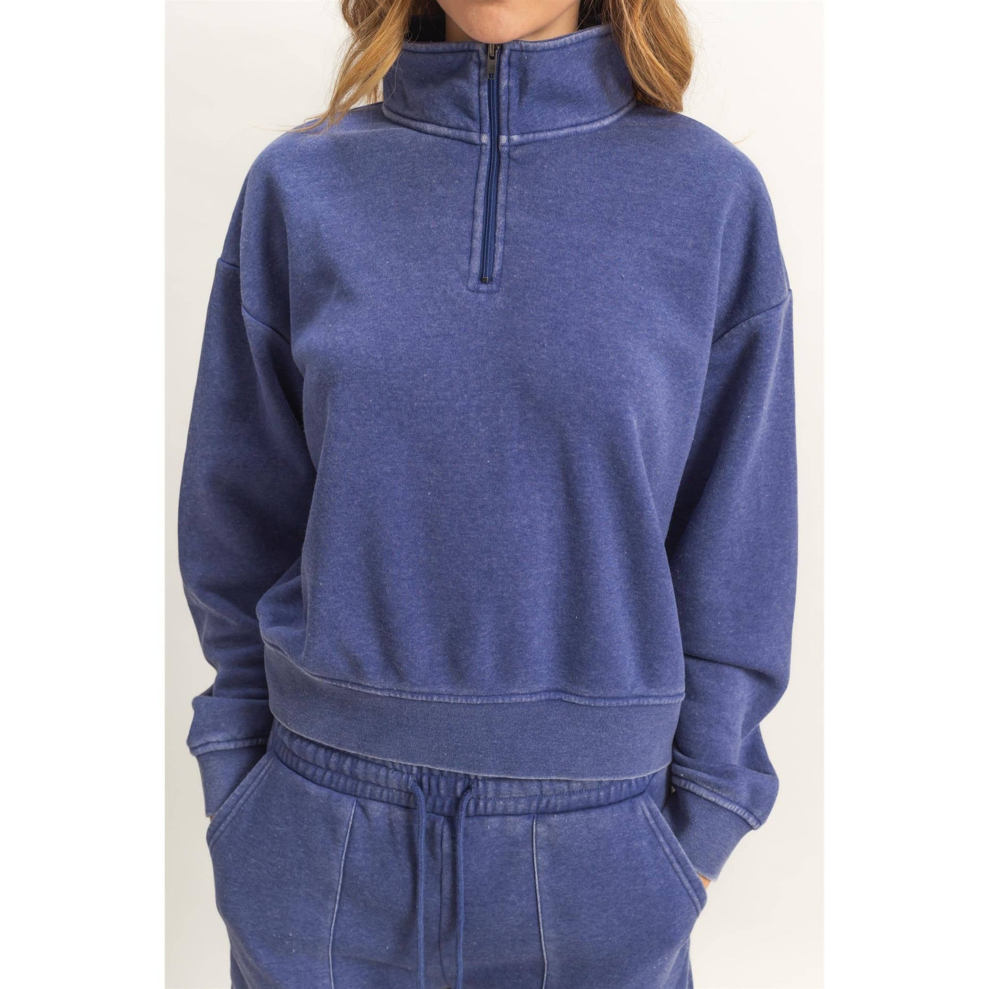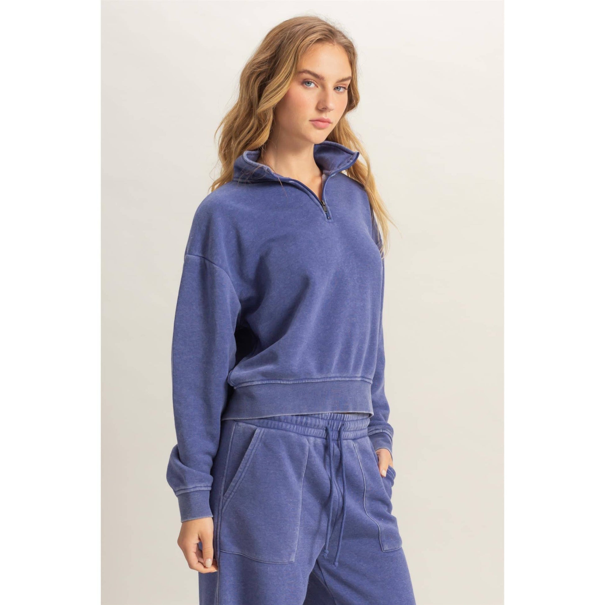 Take A Break And In This Brushed Terry Knit Sweatshirt That Shapes Into A Cute Top That Has A Standing Collared Neckline Boasting A Half Zipper At Front, Long Sleeves With Drop Shoulders, And Banded Cuffs. A Casual Boxy Bodice Ends With A Banded Hem.