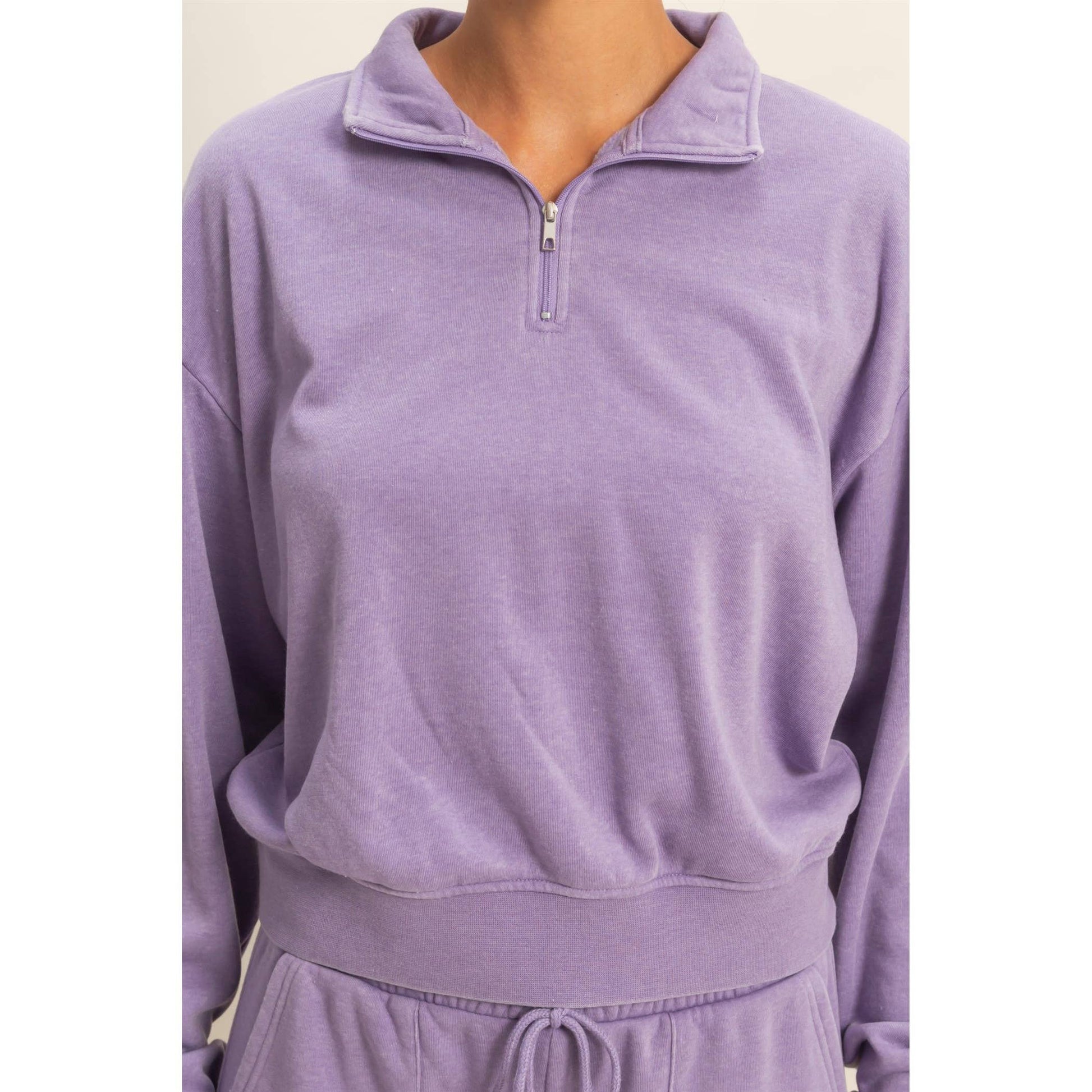 This pullover is crafted from burnout washed french terry, giving the fabric a soft, lived-in texture. The design features a high stand collar neckline with a convenient half-zip closure, and long drop-shoulder sleeves with traditional ribbed cuffs. It is a relaxed, slightly cropped fit.