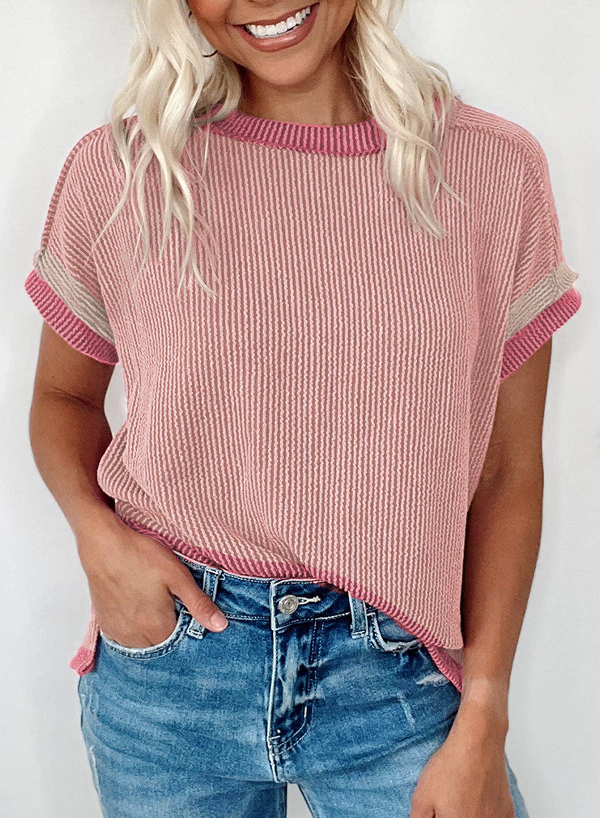 Knitted Crewneck Short-sleeved T-shirt with Contrasting Panels