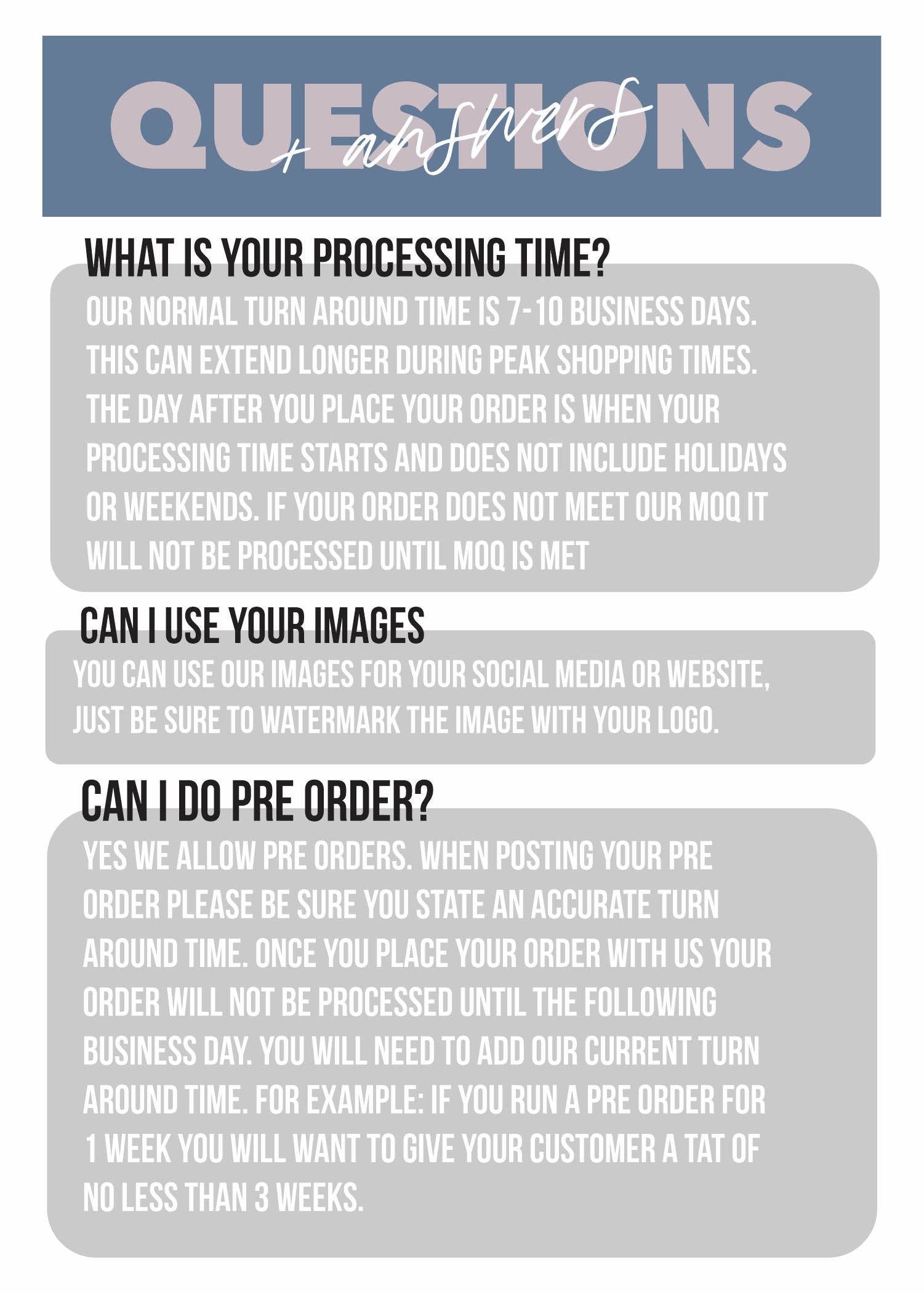 -Turn around runs 7-10 business days. This starts the day after you place your order and does not include Saturdays, Sundays, and Holidays.