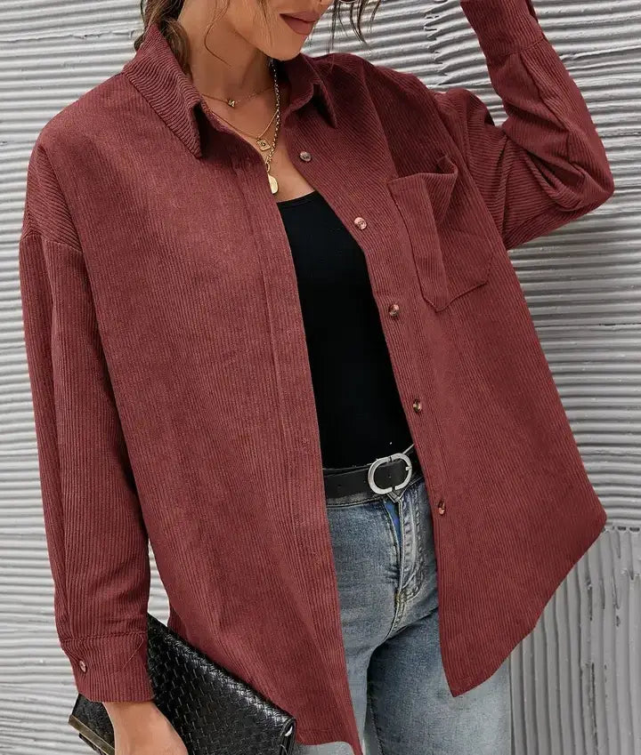 Features: Women's solid color corduroy casual shirt, loose long sleeve shirt, single chest pocket, front button design, autumn fashion shirt blouse, ribbed shirt, corduroy jacket jacket, button cuffs, high and low swing.